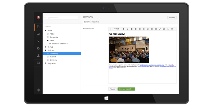 Our built-in media library makes it a breeze to manage digital assets. Umbraco automatically scales your photos, lets you do cropping with a single click and makes your shots responsive too.